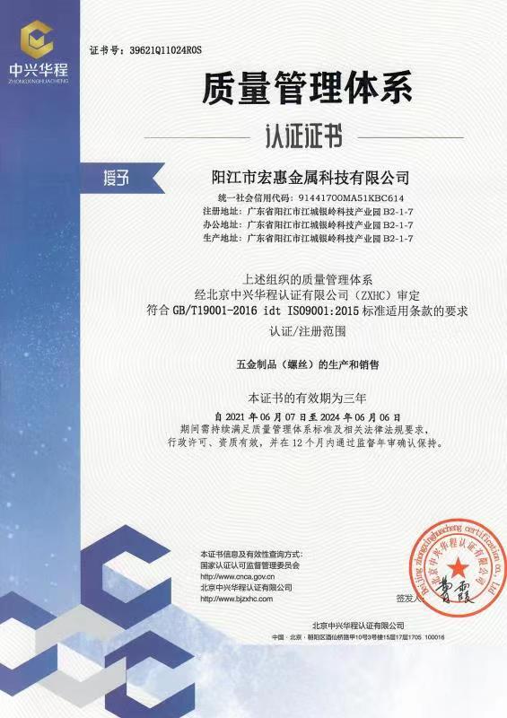 廣東宏惠金屬公司是家20多年一直專注鉆尾螺絲開發(fā)與生產的企業(yè),是國內較早做鉆尾的廠家之一,同時也是國內專業(yè)開發(fā)生產鉆尾螺絲的企業(yè)之一。 我司地址為于廣東省陽江市江銀嶺科技園距沈海高速白沙出口不到2公里,距陽江高鐵站也只有十余公里交通便利。 公司占地120畝,擁有超500臺套專業(yè)設計 生產 檢測設備。一個超200人的專業(yè)團隊,能夠嚴格按照ISO9001質量體系要求生產符合GB DIN AS3566 ANSI JIS BS等標準的產品,生產銷售各種高品質緊固件系列產品,為中高端客戶提供優(yōu)質服務。也可按照客戶要求設計生產各種鉆尾,年產高品質碳鋼 不銹鋼鉆尾螺絲2萬余噸.在各大客戶的鼎力支持下產品暢銷全國,并遠銷亞 非 拉 歐等地,在這20多年發(fā)展的道路上我司堅持“以質量求生存,以信譽求發(fā)展”的精神理念不斷完善公司體系。